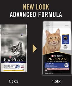 Purina PRO PLAN ADULT CAT 7+, SALMON & TUNA, combines all essential nutrients including vitamins A, C and E, also Omega 3 and 6 Fatty Acids in a high quality diet for cats.