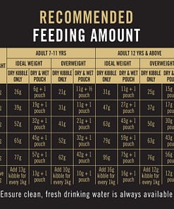 | Above 6kg | Add 13g kibble for every 1kg | 13g + 1 pouch | Add 10g kibble for every 1kg | 10g + 1 pouch | Add 16g kibble for every 1kg | 16g + 1 pouch | Add 12g kibble for every 1kg | 12g + 1 pouch |
