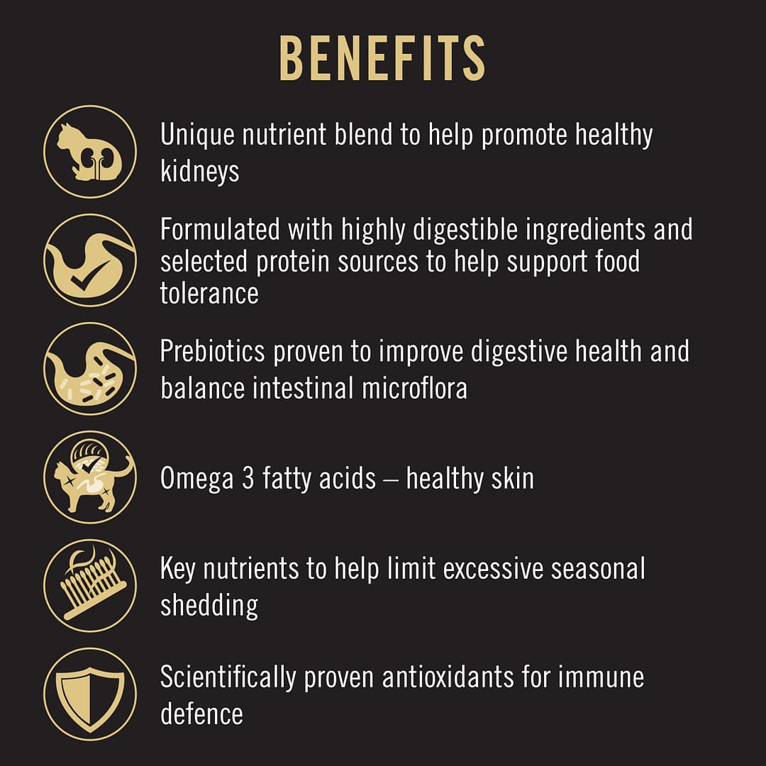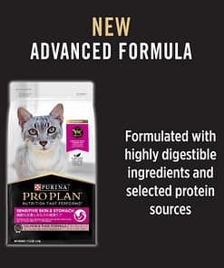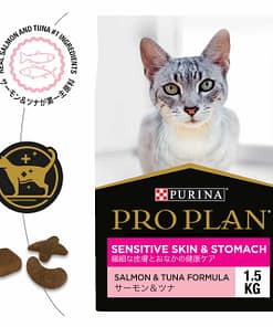 Purina PRO PLAN ADULT CAT, SENSITIVE SKIN & STOMACH, SALMON & TUNA combines all essential nutrients including vitamins A, C and E in a high quality diet for cats. It contains natural prebiotics which are proven to improve digestive health and balance intestinal microflora and Omega 3 fatty acids which promotes healthy skin. Furthermore, it contains guaranteed live probiotics to support digestive and immune health, and a unique nutrient blend to help promote healthy kidneys.