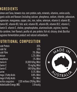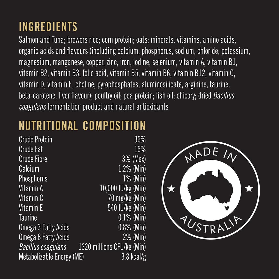 Salmon and Tuna; brewers rice; corn protein; oats; minerals