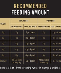 Above 6 Kg | Add 13g kibble for every 1kg | 13g + 1 pouch | Add 11g kibble for every 1kg | 11g + 1 pouch |
