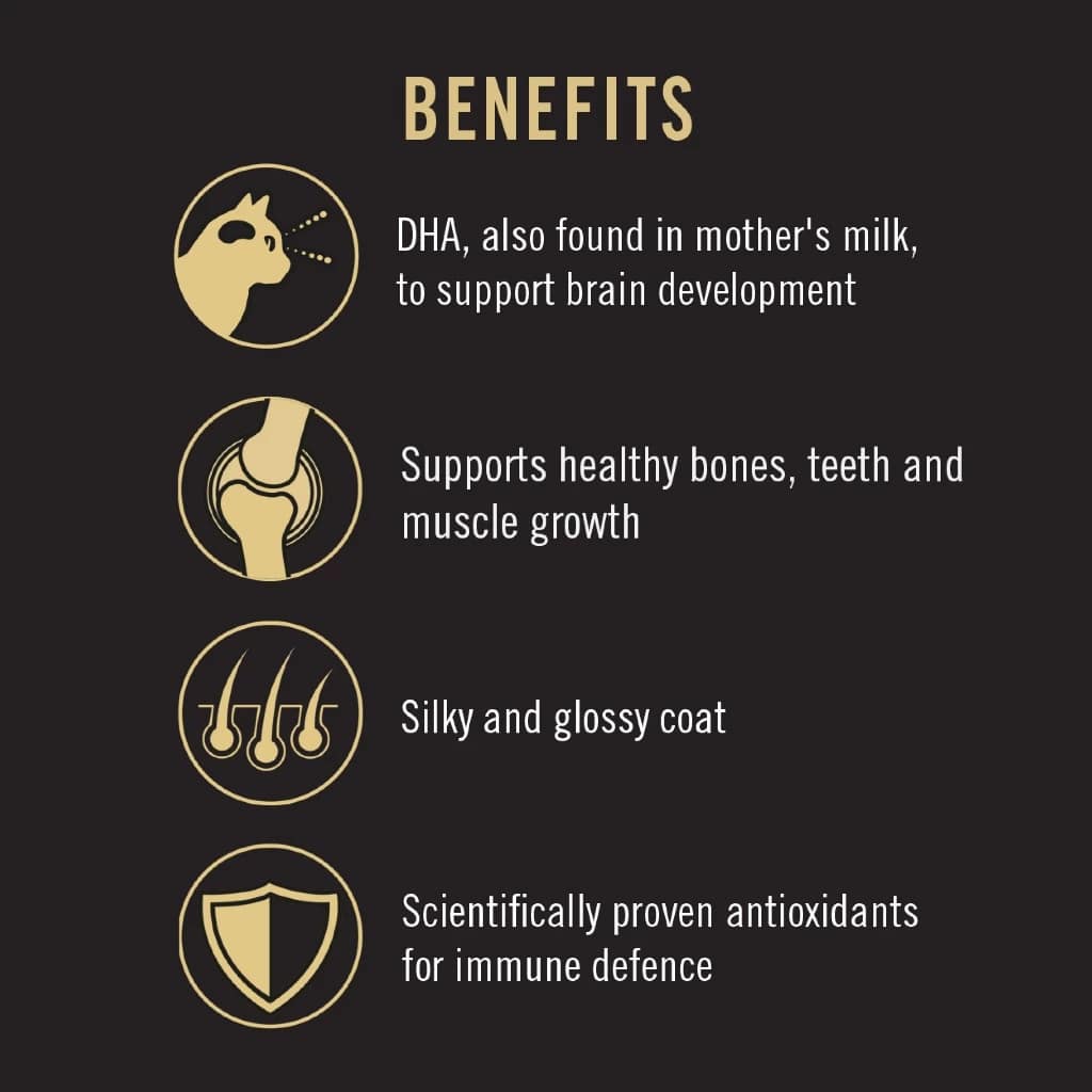 Purina PRO PLAN KITTEN, CHICKEN combines all essential nutrients including DHA to support brain development, vitamins C and D with colostrum to develop a healthy immune system, in a high protein diet. Suitable for kittens up to 1 year before they transition to an adult food.