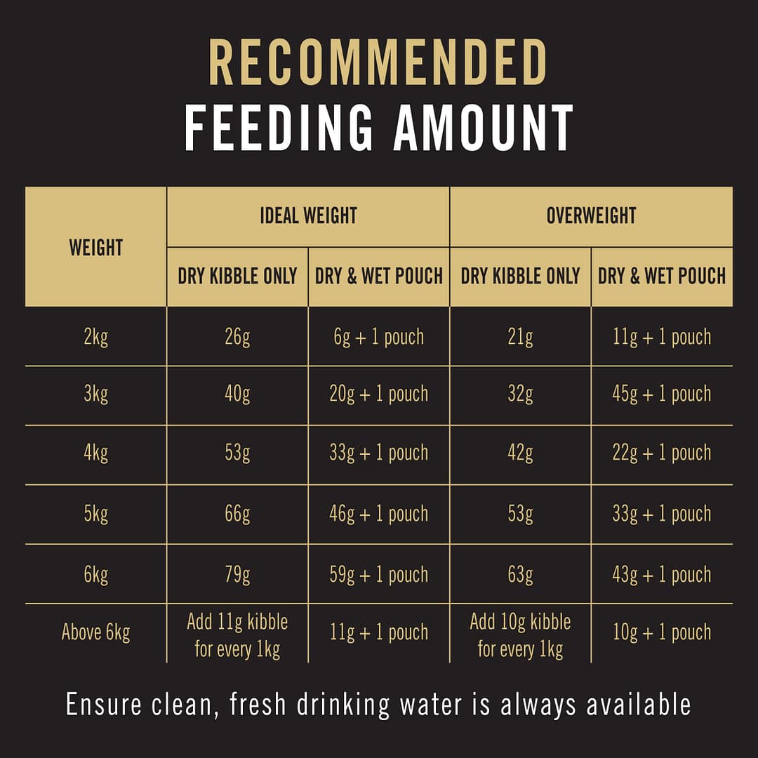 Above 6 Kg | Add 11g kibble for every 1kg | 11g + 1 pouch | Add 10g kibble for every 1kg | 10g + 1 pouch |