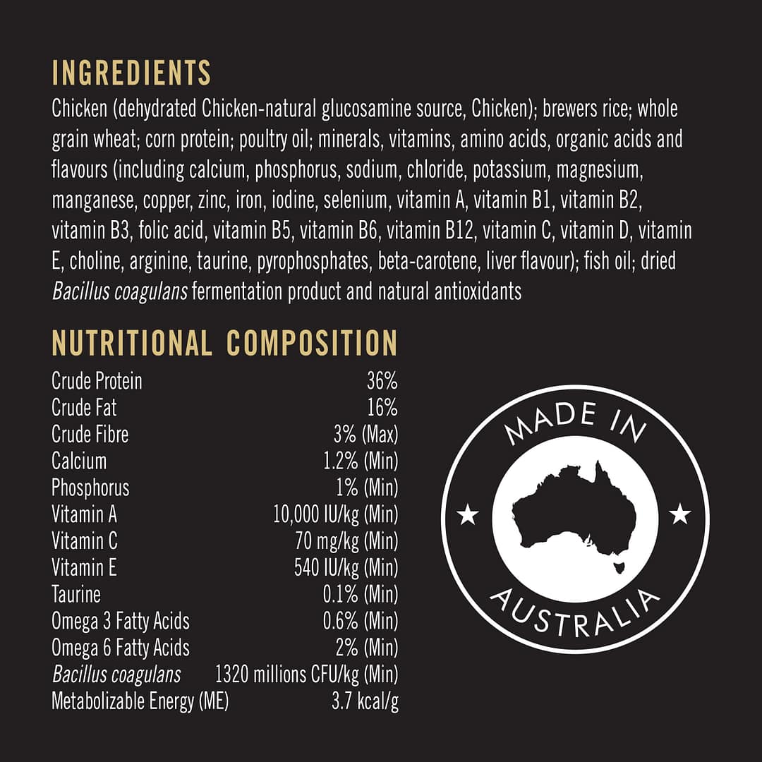 Whole grain wheat, Corn protein, Poultry oil, Minerals, Vitamins, Amino acids, Organic acids and flavours (including calcium, phosphorus, sodium, chloride, potassium, magnesium, manganese, copper, zinc, iron, iodine, selenium, vitamin A, vitamin B1, vitamin B2, vitamin B3, folic acid, vitamin B5, vitamin B6, vitamin B12, vitamin C, vitamin D, vitamin E, choline, arginine, taurine, pyrophosphates, beta-carotene, liver flavour)