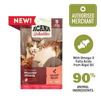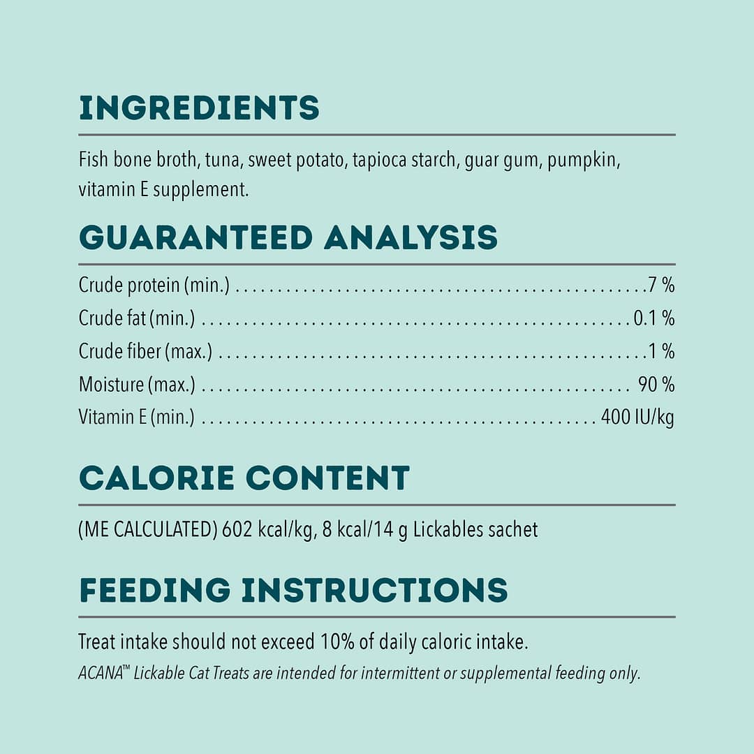 (ME CALCULATED) 556 kcal/kg (8 kcal per 14g pouch). ACANA Lickable Cat Treat Tuna in Bone Broth recipe is intended for intermittent or supplemental feeding only. Treat intake should not exceed 10% of daily caloric intake.