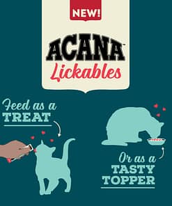 Share a special moment with your cat by treating them to delicious ACANA Lickables! Crafted with protein-rich animal ingredients and hydrating bone broth, Lickables treats will tempt your cat to come closer and purr with enjoyment as they bond with you and experience a burst of flavor. These treats are the perfect texture for hand feeding simply knead, tear and squeeze the pouch to feed your cat a delicious pure, without any mess. Our Tuna Recipe also helps support immune health, giving your cat benefits in every pouch. Your cat will love this creamy, smooth pure, and youll love getting closer to your favorite furry friend!