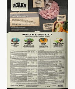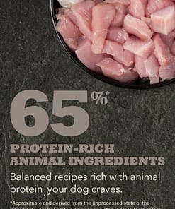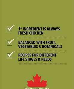 Fresh chicken meat (16%), chicken meal (14%), turkey meal (14%), red lentils, whole green peas, pea fibre, fresh chicken giblets (liver, heart, kidney) (5%), herring meal (5%), cage-free eggs (4%), fresh whole flounder, (4%), sun-cured alfalfa (4%), field beans (4%), green lentils, whole yellow peas, chicken fat (1%), herring oil, (1%), fresh chicken cartilage (1%), dried brown kelp, fresh whole pumpkin, fresh whole butternut squash, fresh whole parsnips, fresh kale, fresh spinach, fresh mustard greens, fresh turnip greens, fresh whole carrots, fresh Red Delicious apples, fresh Bartlett pears, freeze-dried chicken liver, freeze-dried turkey liver, fresh whole cranberries, fresh whole blueberries, chicory root, turmeric, milk thistle, burdock root, lavender, marshmallow root, rose hips.