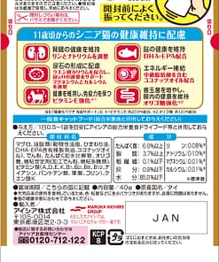 | Ingredients | Tuna,Oils(Chicken oil, Sunflower oil,DHA – EPA oil,Coconut oil), Protein hydrolyzate, Lactosucrose, Thickening agents(Modified starch, Jelly agents), Vitamins(A,D,E,K,B1,B2,B6,B12, Niacin, Pantothenic acid, Folic acid, Choline,Potassium citrate) |