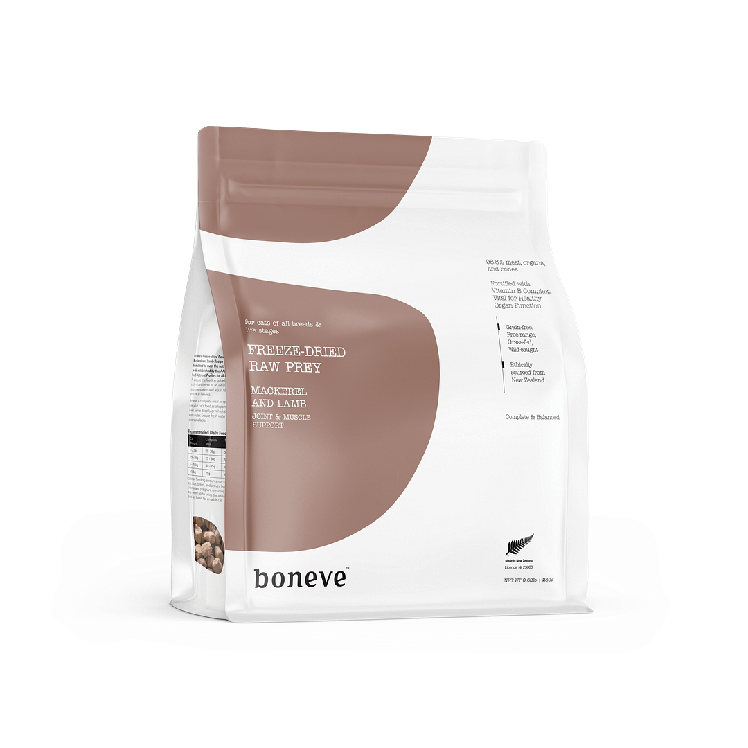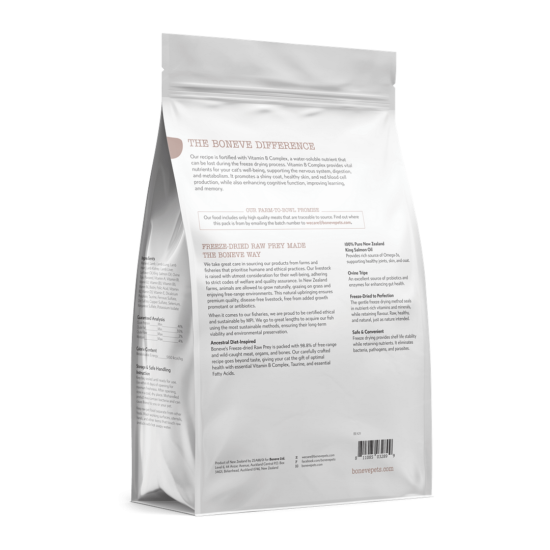 Boneve’s Freeze-dried Raw Prey Chicken and Salmon Recipe for Cats is formulated to meet the