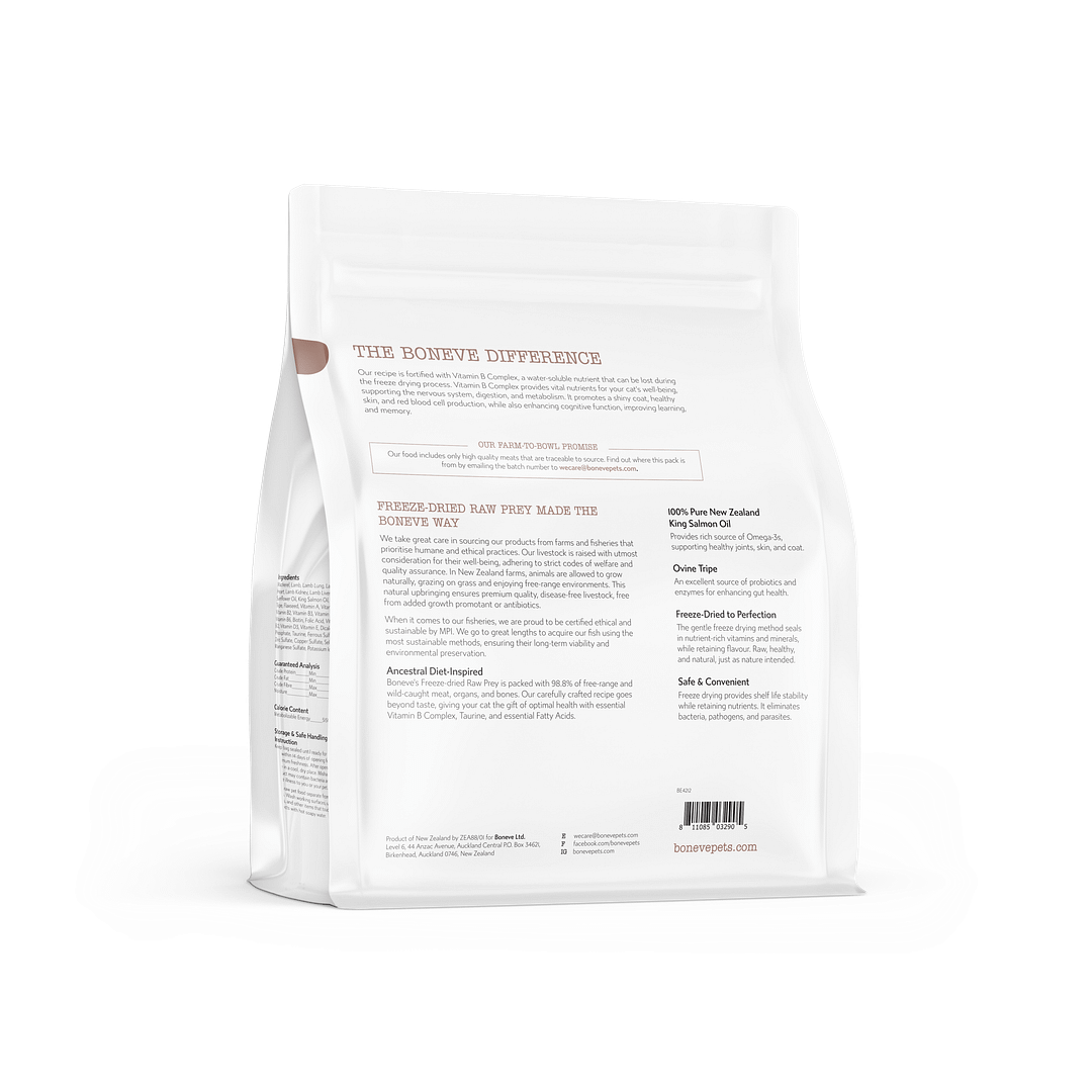 minerals, and essential fatty acids. Enriched with Green Ovine Tripe for better gut health and 100% Pure King Salmon Oil for beautiful skin and coat. Gently freeze-dried to lock in flavours and nutrients