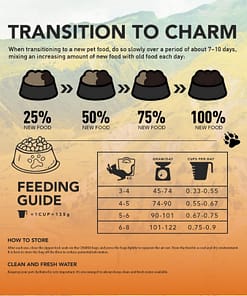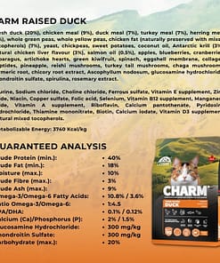 Ingredients: Fresh duck (20%), chicken meal (9%), duck meal (7%), turkey meal (7%), herring meal (7%), whole green peas, whole yellow peas, chicken fat (naturally preserved with mixed tocopherols) (7%), yeast, chickpeas, sweet potatoes, coconut oil, Antarctic krill (3%), natural chicken liver flavour (3%), salmon oil (0.5%), apples, blueberries, cranberries, asparagus, artichoke hearts, green kiwifruit, spinach, eggshell membrane, collagen peptides, pineapple, reishi mushrooms, turkey tail mushrooms, chaga mushrooms, turmeric root, chicory root extract, Ascophyllum nodosum, glucosamine hydrochloride, chondroitin sulfate, spirulina, rosemary extract.