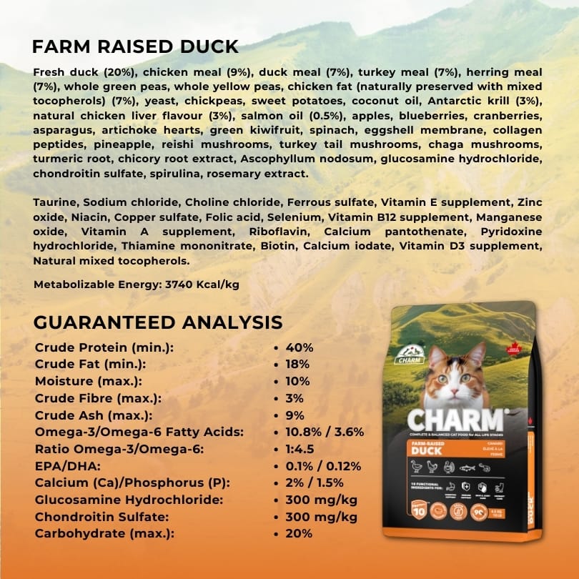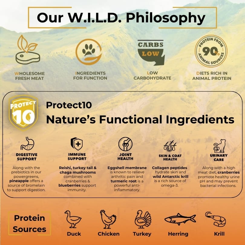Crafted for nutrition and taste, our Farm-Raised Duck recipe features high inclusions of fresh duck combined with turkey, whole eggs, & seafood. We’ve added nutrient-dense Powergreens and our Protect10™ blend of nature’s most powerful functional ingredients for a vitality boost. Whether your cat likes to stay indoors or go outside to explore, this protein-rich recipe is sure to keep your cat happy and healthy.