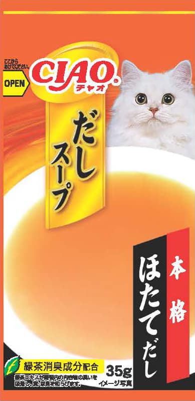 CIAO Dashi Soup Line Pouches are savoury and creamy, and is an ideal topper to increase palatability, or as a sumptuous appetizer! This is a unique wet cat treat that comes in a line of four that you can easily tear off for your cat to enjoy. The rich taste of CIAO Dashi Soup Pouch makes it irresistible – we’re sure that all cats will love this highly palatable wet treat. Fortified with Vitamin E and Green Tea Extract, this treat also provides all-rounded functional support for your cats.
