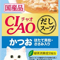 Ciao Clear Soup Chicken Fillet & Scallop Pouch Cat Food is a delicious wet complementary food made with sustainably-sourced cage-free chicken. Highly palatable, Ciao Clear Soup Chicken Fillet & Scallop Pouch Cat Food can be fed as a treat or mixed with your cat’s daily food for a tastier meal. Ciao Clear Soup Chicken Fillet & Scallop Pouch Cat Food has a high moisture content, making it a good source of hydration for your cat. Formulated with antioxidant-rich green tea extract, Ciao Clear Soup Chicken Fillet & Scallop Pouch Cat Food also promotes better oral health. Ciao Clear Soup Chicken Fillet & Scallop Pouch Cat Food is easy to feed; simply tear open the pouch and pour out to serve!