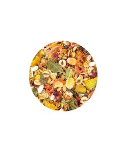 Ingredients | 2 vegetables (carrots, pumpkin), 7 herbs (dandelion leaves, oatmeal, leaf plantain, raspberry leaves, marigold, rosehip, nettle) and grains (corn, barley, oats, wheat puffs, rice puffs) |