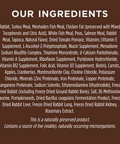 Rabbit, Turkey Meal, Menhaden Fish Meal, Chicken Fat (preserved with Mixed Tocopherols), White Fish Meal, Peas, Salmon Meal, Tapioca, Rabbit Meal, Natural Flavor, Dried Tomato Pomace, Vitamins (Vitamin E Supplement, Vitamin A Supplement, L-Ascorbyl-2-Polyphosphate, Niacin Supplement, Menadione Sodium Bisulfite Complex, Thiamine Mononitrate, d-Calcium Pantothenate, Riboflavin Supplement, Pyridoxine Hydrochloride, Vitamin B12 Supplement, Folic Acid, Vitamin D3 Supplement, Biotin), Apples, Carrots, Cranberries, Montlorillonite Clay, Choline Chloride, Minerals (Zinc Proteinate, Iron Proteinate, Copper Proteinate, Manganese Proteinate, Sodium Selenite, Ethylenediamine Dihydriodide), Potassium Chloride, Freeze Dried Rabbit (including Ground Rabbit Bone), Salt, Taurine, DL-Methionine, Pumpkinseeds, Freeze Dried Rabbit Liver, Dried Bacillus coagulans Fermentation Product, Freeze Dried Rabbit Lung, Freeze Dried Rabbit Kidney, Rosemary Extract.