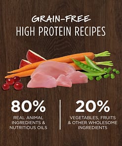 - 80% real animal ingredients and nutritious oils; 20% vegetables, fruits and other wholesome ingredients; 0% grain