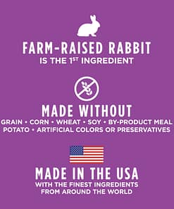 - Farm-raised rabbit is the first ingredient – packed with animal protein for strong, lean muscles