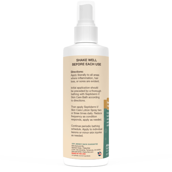 Septiderm-V Skin Care Lotion Spray is a soothing, non-greasy lotion for use on dogs and cats over the age of 6 weeks. It may be applied as often as necessary and is recommended to be used in conjunction with regular bathing with Septiderm-V Skin Care Bath. Excellent for all skin-related problems. Use for: