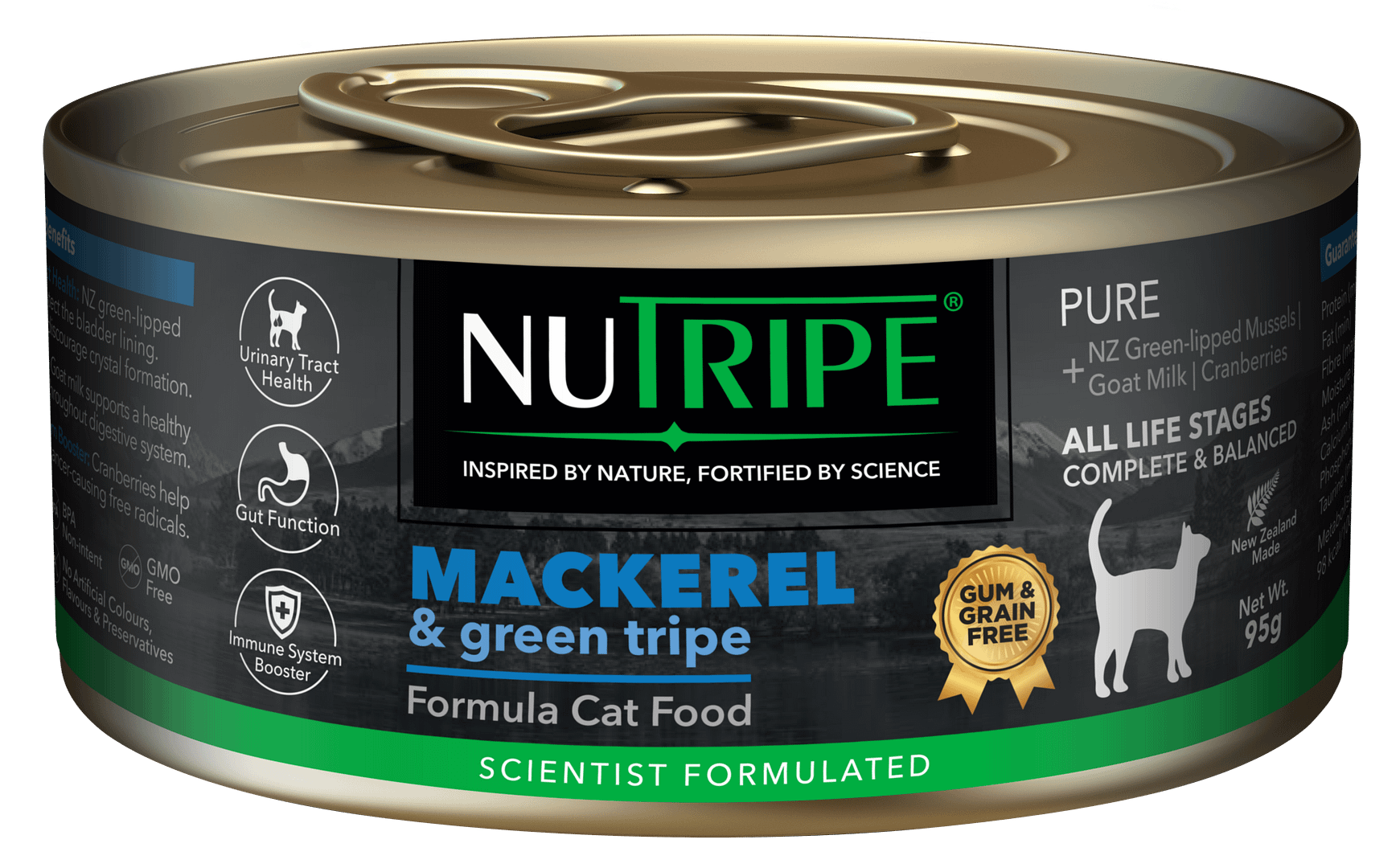 Our mackerel and green tripe formula is a palatable and protein-rich recipe for cats that enjoy the taste of marine fish sourced from New Zealand’s clean oceans. Mackerel is also rich in omega fatty acids, vitamins and mineral content, making it great for anti-inflammation, muscle-building as well as the maintenance of healthy skin and coat for cats.