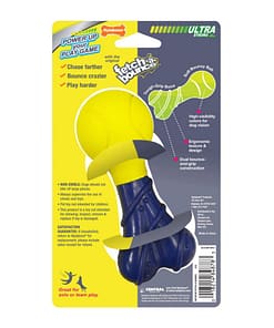 Power up playtime with Power Play Dog Toys from Nylabone! The dual-sided Fetch-a-Bounce gives your furry friend the best of both worlds with a bouncy dog ball on one end and a tough-grip bone on the other. Built with ultra-strong, heavy-duty natural rubber, the ball end creates a fascinating erratic bounce while the bone gives your dog the familiar shape they love. Perfect for a game of fling and fetch, this interactive dog toy can soar up to 80 feet! Give it a throw and watch your four-legged play buddy enjoy the toy?s different flight patterns, from flipping to spiraling. Plus, your dog will easily spot your Fetch-a-Bounce in the grass, sand, or any other surface because this bright blue and yellow dog toy is designed in colors that are highly visible to dogs. Chase farther, bounce crazier, and play harder with the Original Fetch-a-Bounce rubber dog toy!