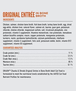 This diet also includes succulent WholePrey ingredients like chicken liver to provide your cat with rich and varied nutrients. Bone broth helps support your cats hydration, while also adding tempting flavour. Nourish your cat with the texture and variety of raw animal ingredients packed into every can of ORIJEN Chunks & Shreds.