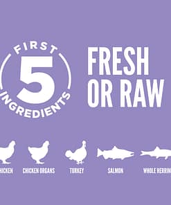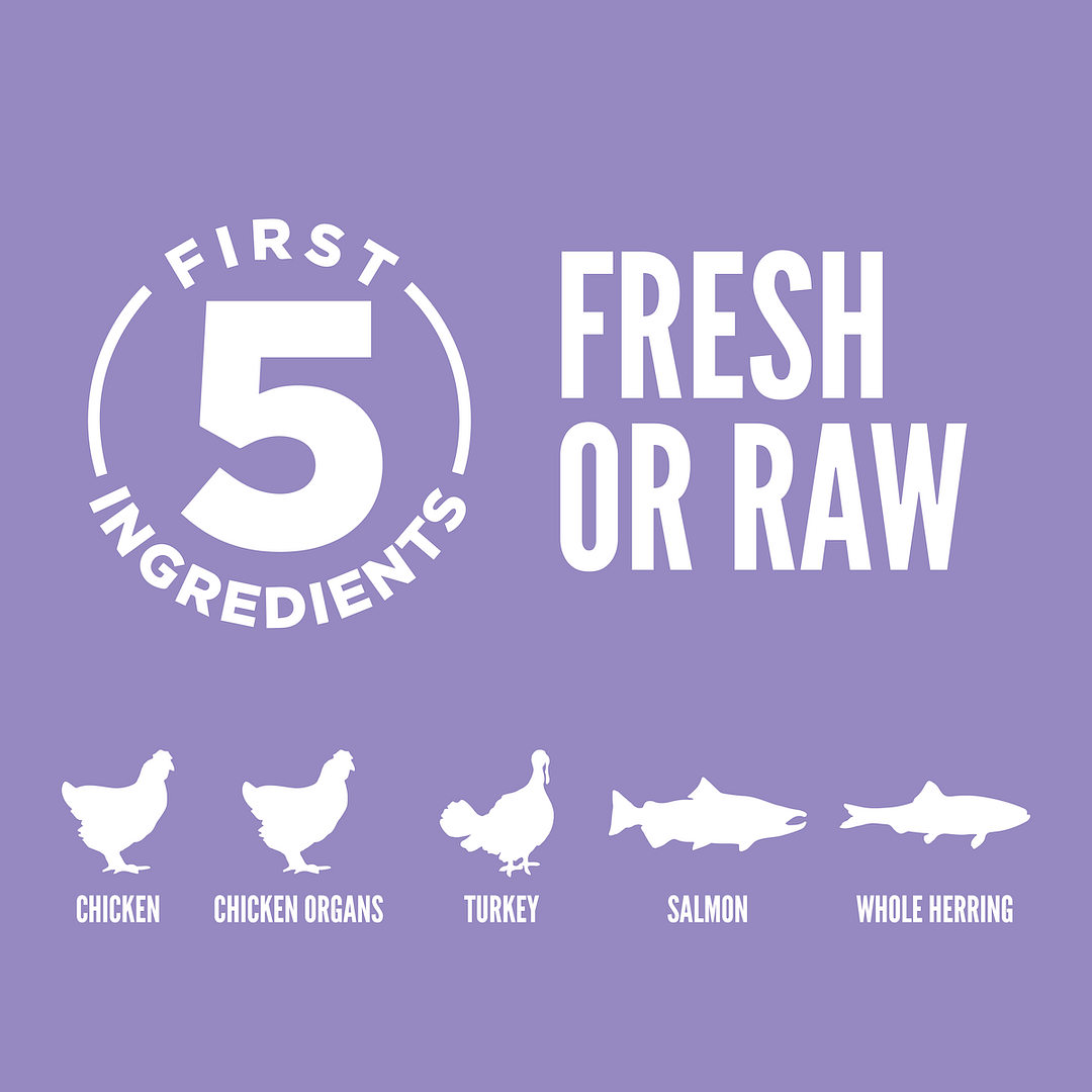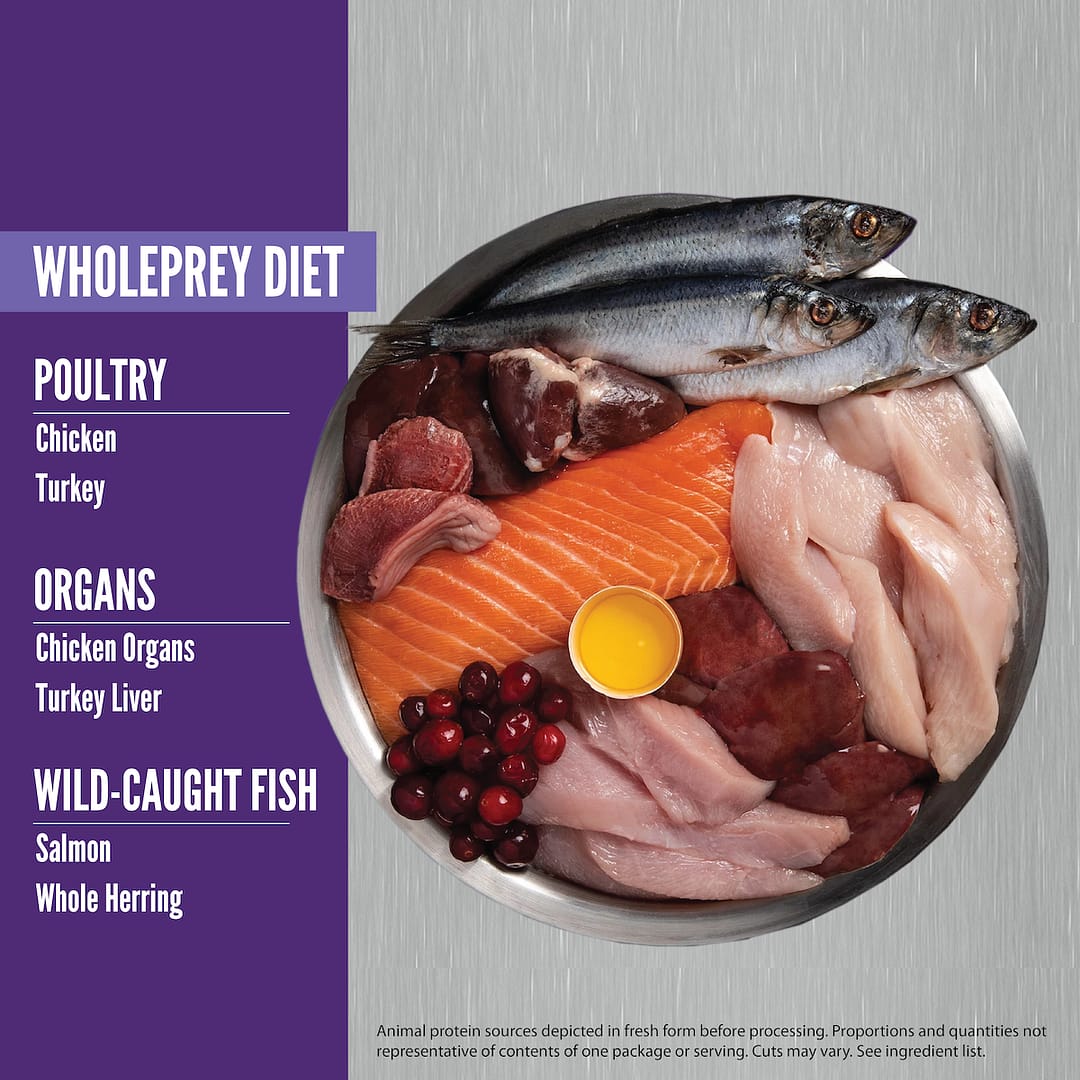 Our authentic WholePrey diet features the most nourishing parts of the prey like poultry or fish, and organs to mimic what your dog’s ancestors consumed in the wild. - Helps support your large breed dog’s joint health with naturally occurring Omega-3 fatty acids from wild-caught herring and salmon, plus calcium from poultry ingredients.