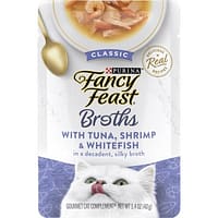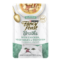 Create a gourmet dining experience for your cat with a Purina Fancy Feast Broths Classic With Tuna, Anchovies & Whitefish Gourmet adult cat food complement. Morsels of real tuna, anchovies and whitefish combine in this grain free wet cat food mixer to offer the delicate seafood flavors cats love, and the decadent, silky broth for cats will have her lapping up every last mouthwatering drop.