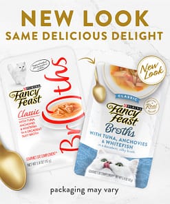 - With tuna, anchovies and whitefish, this broth for cats is part of the complete line of Purina Fancy Feast gourmet cat complements