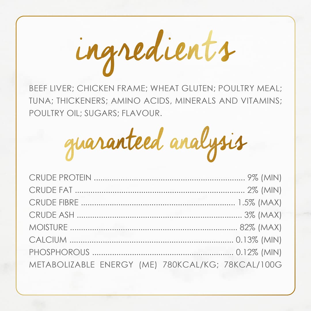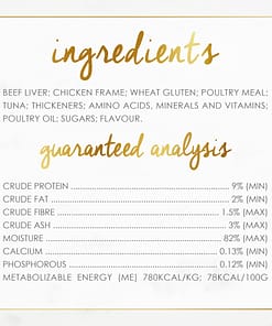 CHICKEN FRAME; WHEAT GLUTEN; BEEF LIVER; POULTRY MEAL; LAMB LIVER; THICKENERS; AMINO ACIDS, MINERALS AND VITAMINS; TUNA; POULTRY OIL; SUGARS.