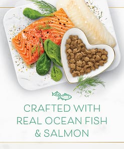 Brewers rice, poultry by-product meal, corn gluten meal, animal fat preserved with mixed-tocopherols (form of Vitamin E), ground yellow corn, soybean meal, animal liver flavor, ocean fish, salmon, phosphoric acid, calcium carbonate, salt, natural and artificial flavors, dried yeast, potassium chloride, added color (Yellow 5, Blue 2, Red 40 and other color), choline chloride, dried spinach, parsley flakes, taurine, zinc sulfate, ferrous sulfate, Vitamin E supplement, manganese sulfate, niacin, Vitamin A supplement, calcium pantothenate, thiamine mononitrate, copper sulfate, riboflavin supplement, Vitamin B-12 supplement, pyridoxine hydrochloride, folic acid, Vitamin D-3 supplement, calcium iodate, biotin, menadione sodium bisulfite complex (source of Vitamin K activity), sodium selenite.