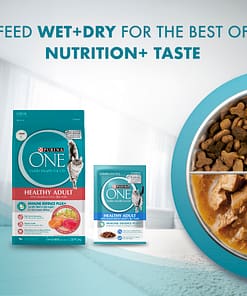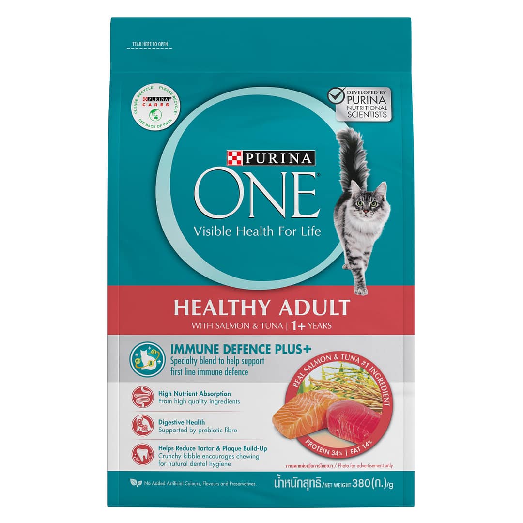 Developed by PURINA Vets and Nutritionists, Purina ONE Healthy Adult with Immune Defence Plus+ is made with 100% complete and balanced nutrition and contains all the key nutrients your cat needs to help support their lifelong health. This recipe is made with real salmon & tuna as the #1 ingredient, because delicious taste combined with superior nutrition is at the heart of your cat’s health and happiness.
