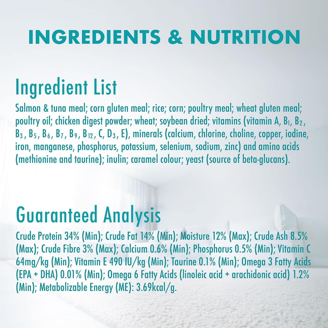 Salmon & tuna meal; corn gluten meal; rice; corn; poultry meal; wheat gluten meal; poultry oil; chicken digest powder; wheat; soybean dried; vitamins (vitamin A, B1, B2, B3, B5, B6, B7, B9, B12, C, D3, E), minerals (calcium, chlorine, choline, copper, iodine, iron, manganese, phosphorus, potassium, selenium, sodium, zinc) and amino acids (methionine and taurine); inulin; caramel colour; yeast (source of beta-glucans).