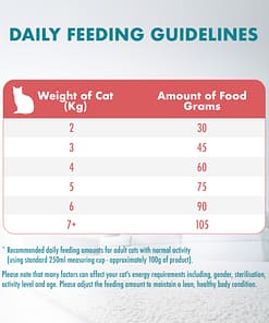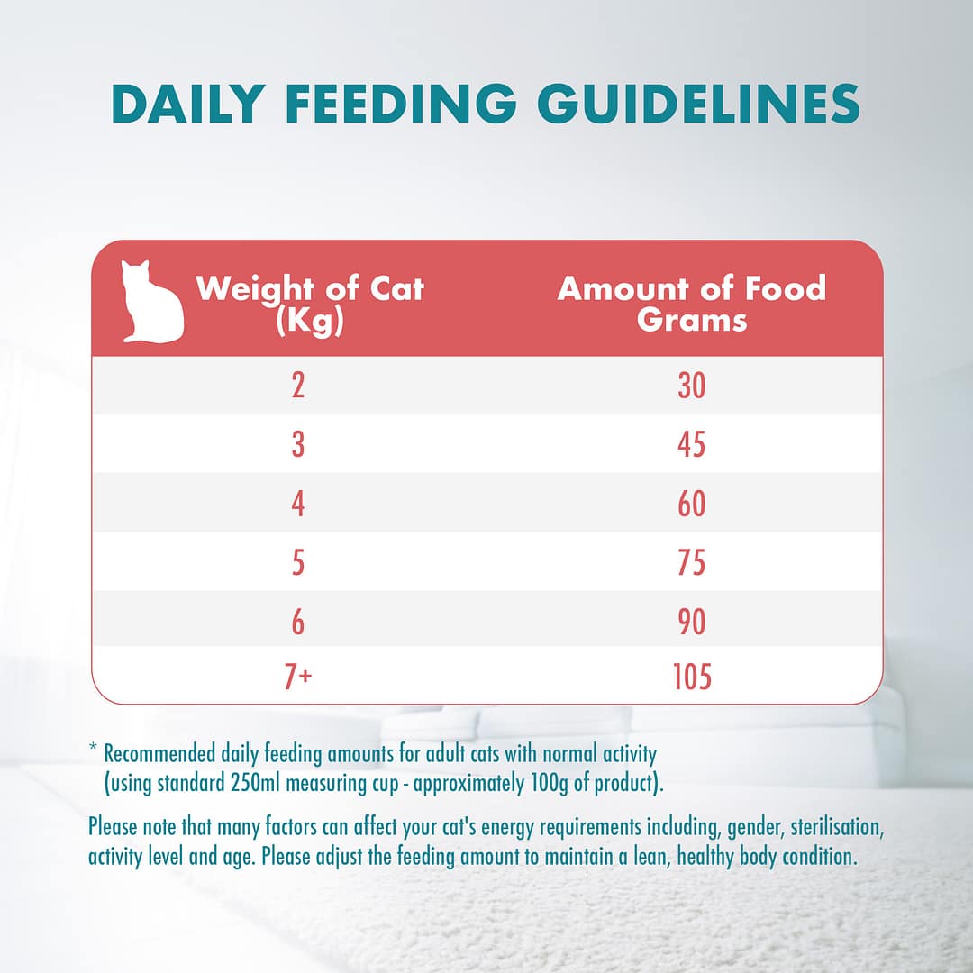Please note that many factors can affect your cat’s energy requirements including, gender, sterilization, activity level, and age. Please adjust the feeding amount to maintain a lean, healthy body condition.