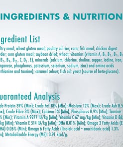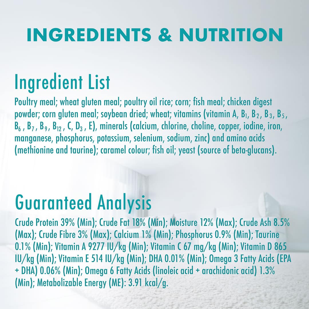 Poultry meal; wheat gluten meal; poultry oil; rice; corn; fish meal; chicken digest powder; corn gluten meal; soybean dried; wheat; vitamins (vitamin A, B1, B2, B3, B5, B6, B7, B9, B12, C, D3, E), minerals (calcium, chlorine, choline, copper, iodine, iron, manganese, phosphorus, potassium, selenium, sodium, zinc) and amino acids (methionine and taurine); caramel colour; fish oil; yeast (source of beta-glucans).