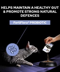 Provide specialized support for your cat by introducing them to PRO PLAN Veterinary Supplements FortiFlora probiotic powder cat food supplement for cats with diarrhea. This cat digestive health formula contains a probiotic strain proven to promote intestinal health and balance. Formulated for the dietary management of cats with cat diarrhea, this safe and effective PRO PLAN for Cats is simple to administer by adding it to your cat’s food. Each packet of this cat probiotics supplement contains a guaranteed level of live microorganisms that help promote beneficial intestinal microflora. A proprietary microencapsulation process helps enhance the stability and survival of the digestive probiotics in FortiFlora for cats until they reach your cat’s intestinal tract. This PRO PLAN® sensitive stomach cat food supplement also contains antioxidants to support cat’s immune system. FortiFlora probiotics for cats supplements are appropriate for administration to both kittens and adult cats.