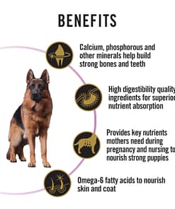 - Provides key nutrients mothers need during pregnancy and nursing to nourish strong puppies