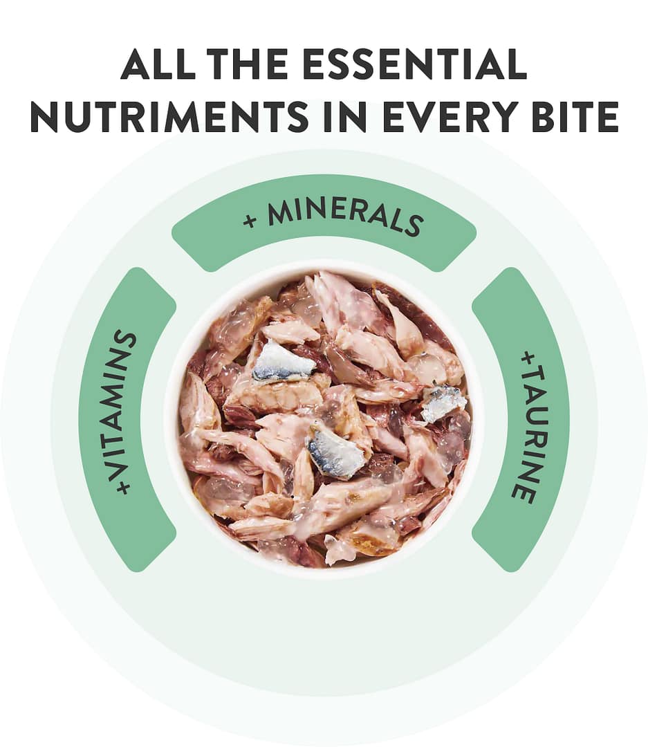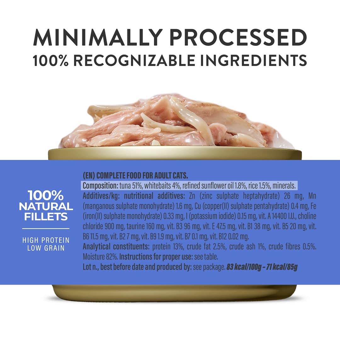 Composition | Tuna 51%, Whitebaits 4%, Refined sunflower oil 2%, Rice 1.5%, Minerals |