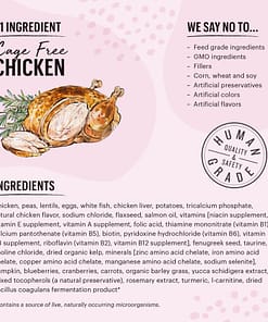 Chicken, peas, lentils, eggs, white fish, chicken liver, potatoes, tricalcium phosphate, natural chicken flavor, sodium chloride, flaxseed, salmon oil, vitamins [niacin supplement, vitamin E supplement, vitamin A supplement, folic acid, thiamine mononitrate (vitamin B1), calcium pantothenate (vitamin B5), biotin, pyridoxine hydrochloride (vitamin B6), vitamin D3 supplement, riboflavin (vitamin B2), vitamin B12 supplement], fenugreek seed, taurine, choline chloride, dried organic kelp, minerals [zinc amino acid chelate, iron amino acid chelate, copper amino acid chelate, manganese amino acid chelate, sodium selenite], pumpkin, blueberries, cranberries, carrots, organic barley grass, yucca schidigera extract, mixed tocopherols (a natural preservative), rosemary extract, turmeric, L-carnitine, dried bacillus coagulans fermentation product* *Contains a source of live, naturally occurring microorganisms.