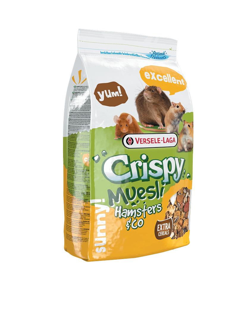 The tasty and protein-rich Crispy Muesli Hamsters Food for hamsters and other omnivorous rodents is a complete food. With delicious puffed grains, lots of vegetables and tasty nuts? Really Sunny! A varied and extra tasty gourmet mix for your hamster. Thanks to the ?Happy & Healthy? pellets it also contains, Crispy Muesli has all the nutrients that your pet needs to live a long, healthy and happy life. The energy-rich composition also keeps the animals in great shape. Extra tasty for a good absorption. This product comes in resealable fresh packs.
