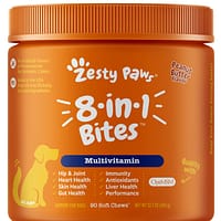 Zesty Paws 8-in-1 Bites support canine companions in eight great ways! These functional supplements support hip and joint function, heart health, skin health, gut function, the immune system, antioxidant levels, liver health, and performance for adult and even senior dogs –small, medium, or large, and regardless of breed.