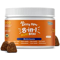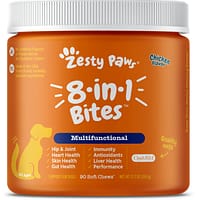Zesty Paws 8-in-1 Bites support canine companions in eight great ways! These functional supplements support hip and joint function, heart health, skin health, gut function, the immune system, antioxidant levels, liver health, and performance for adult and even senior dogs –small, medium, or large, and regardless of breed.