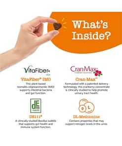 These chews also include Cran-Max (cranberry concentrate) with antioxidants that’s clinically studied to help support urinary tract health. Plus, these chewables also include DL-Methionine, a premium Gut Health Blend (with Amylase, Protease, Lipase, Cellulase, Lactase, Bromelain), and Apple Cider Vinegar for additional support for urinary and gut health.