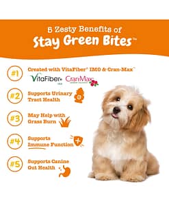 If your pup creates burn spots on your grass when nature calls, our Stay Green Bites may be able to help! Featuring a blend of advanced ingredients, these flavorful soft chews support the urinary tract and gut health to keep your grass looking green and pristine. This functional chewable dog supplement features DE111 Probiotic (Bacillus subtilis) and VitaFiber, which are premium ingredients that support intestinal bacteria and gut function.