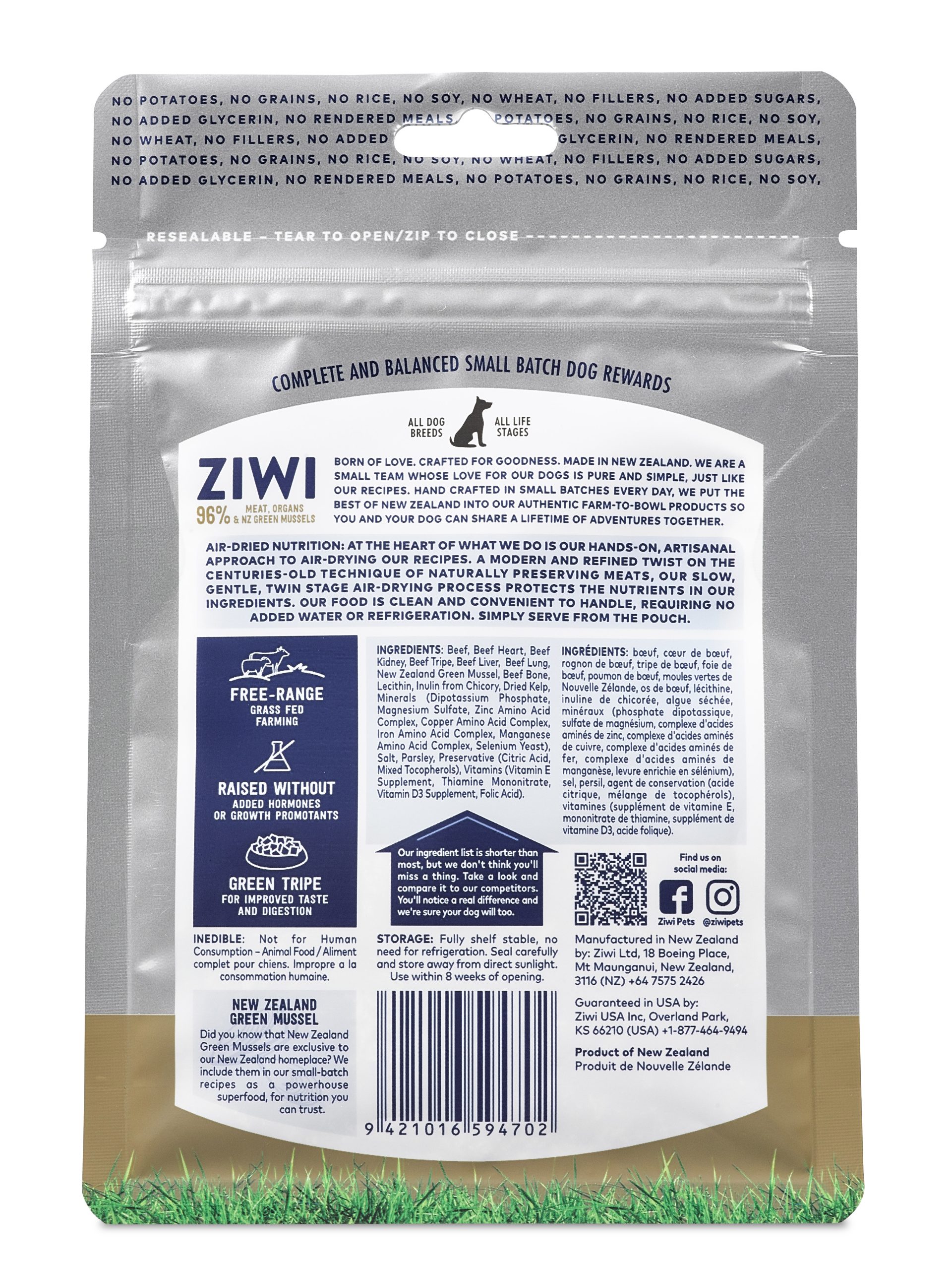 ZIWI Beef Good Dog Rewards contain 96% premium, free-range New Zealand beef meat, including tripe and green mussels. Our Rewards are slowly and gently air-dried to preserve the best of our special New Zealand ingredients. The remainder of the recipe includes hand selected vitamins & Minerals, organic sea kelps, chicory and parsley. This is a great training treat to reward your dog for their good behaviour and recommended by top international dog training, Ian Dunbar.
